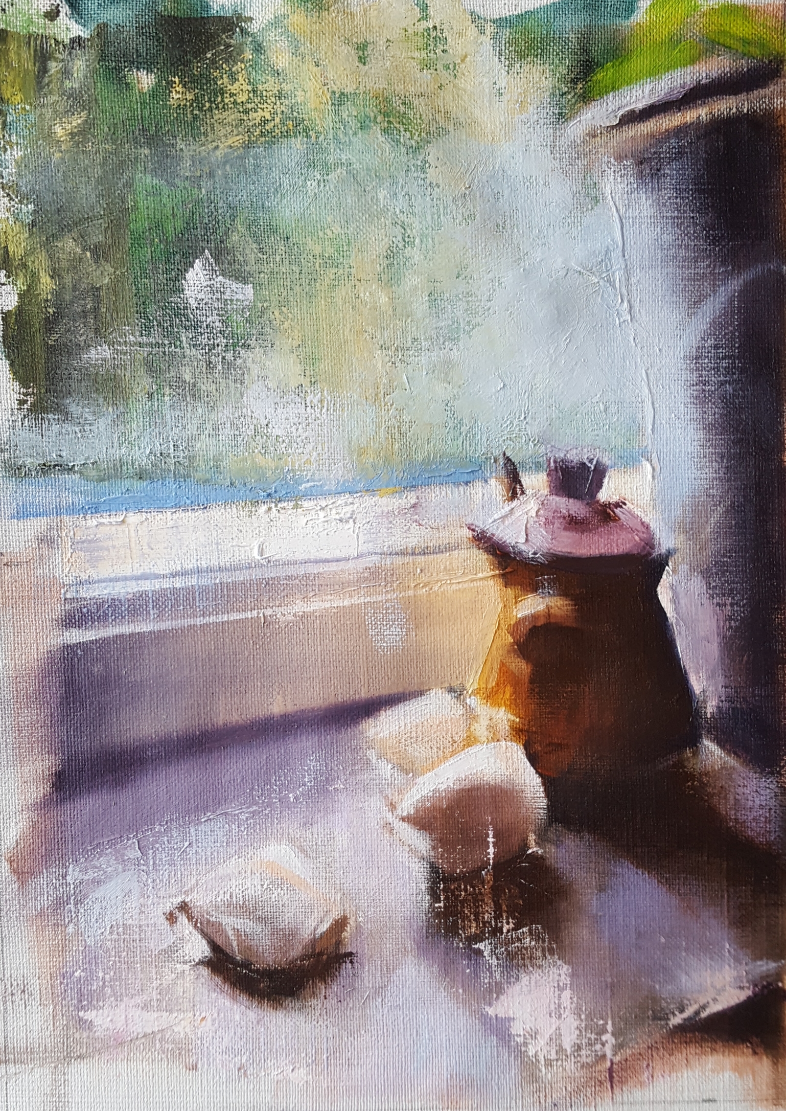 Studie: vitlök och senapsskål i fönster Olja på linneduk 37×28 cm