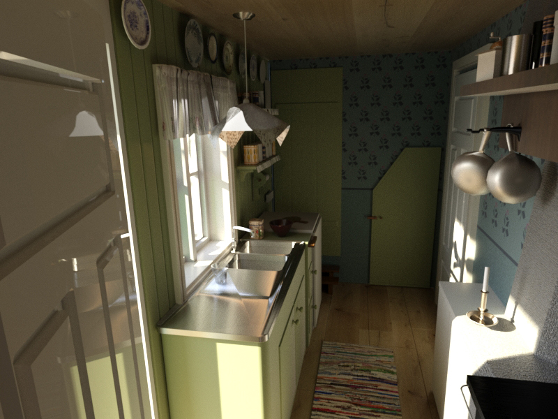 Rendering av ljus, material och objekt tog ca 4 timmar och det är 3ds Max ART renderare som har jobbat och det är fysiska material på hela scenen.